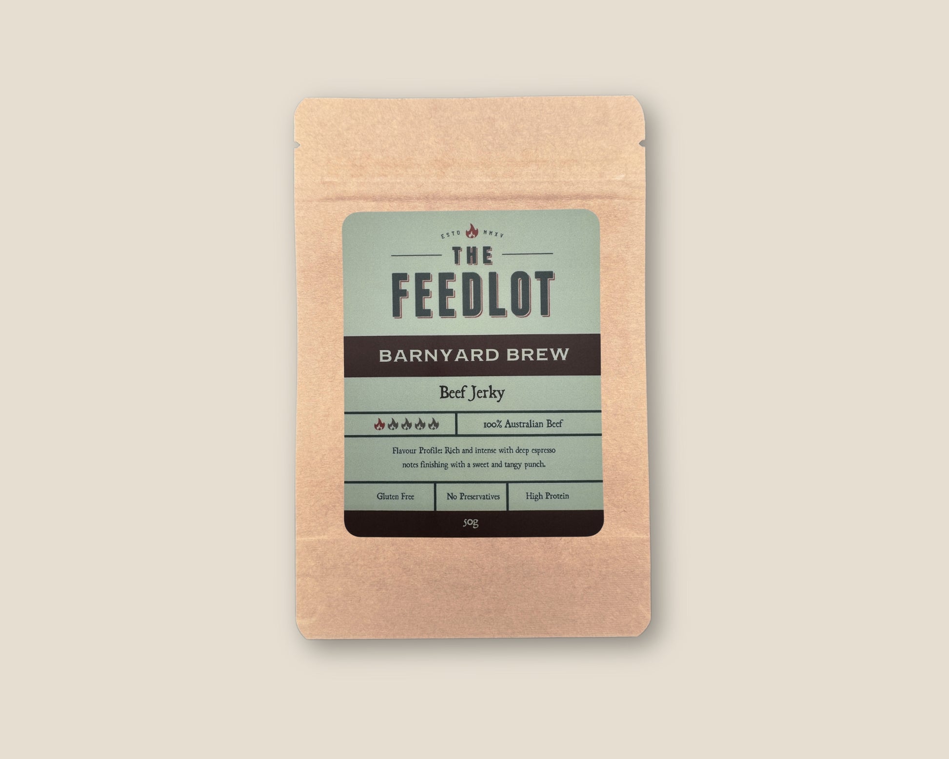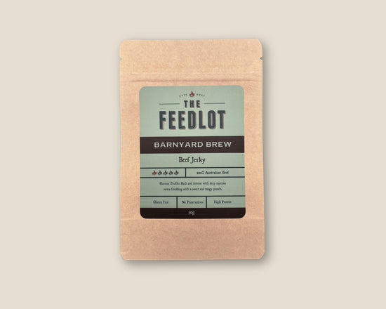 The Feedlot has teamed up with the legends at Killa Jerky to combine the best of both worlds. This beef jerky is powered by Barnyard Brew providing a mild espresso flavour with a subtle chocolate finish. Gluten free and all natural. Enjoy this 50g bag of pure meat bliss paired with a cold beer!