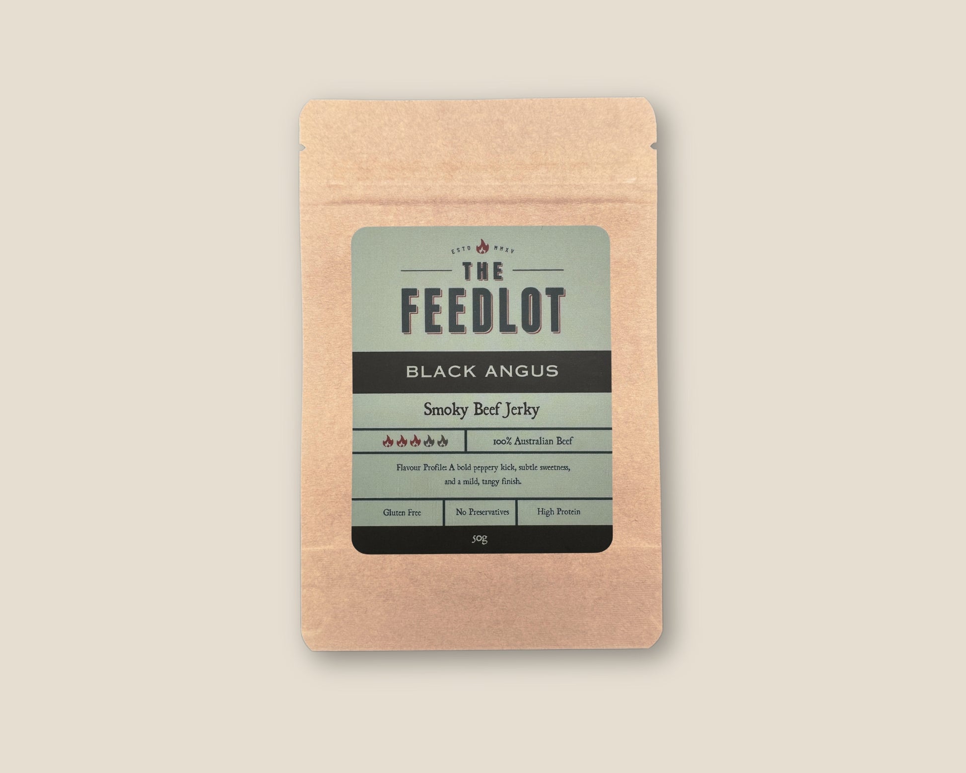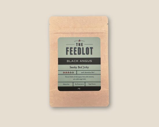 The Feedlot has teamed up with the legends at Killa Jerky to combine the best of both worlds. This smoky beef jerky is powered by Black Angus providing a peppery heat coupled with a sweet and savoury flavour on the back end. Gluten free and all natural. Enjoy this 50g bag of pure meat bliss paired with a cold beer!